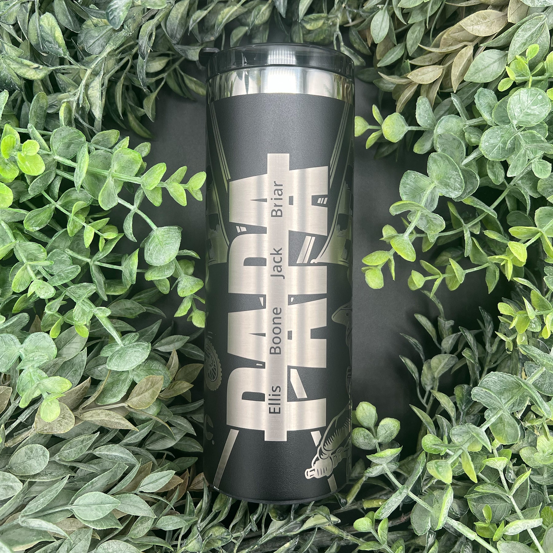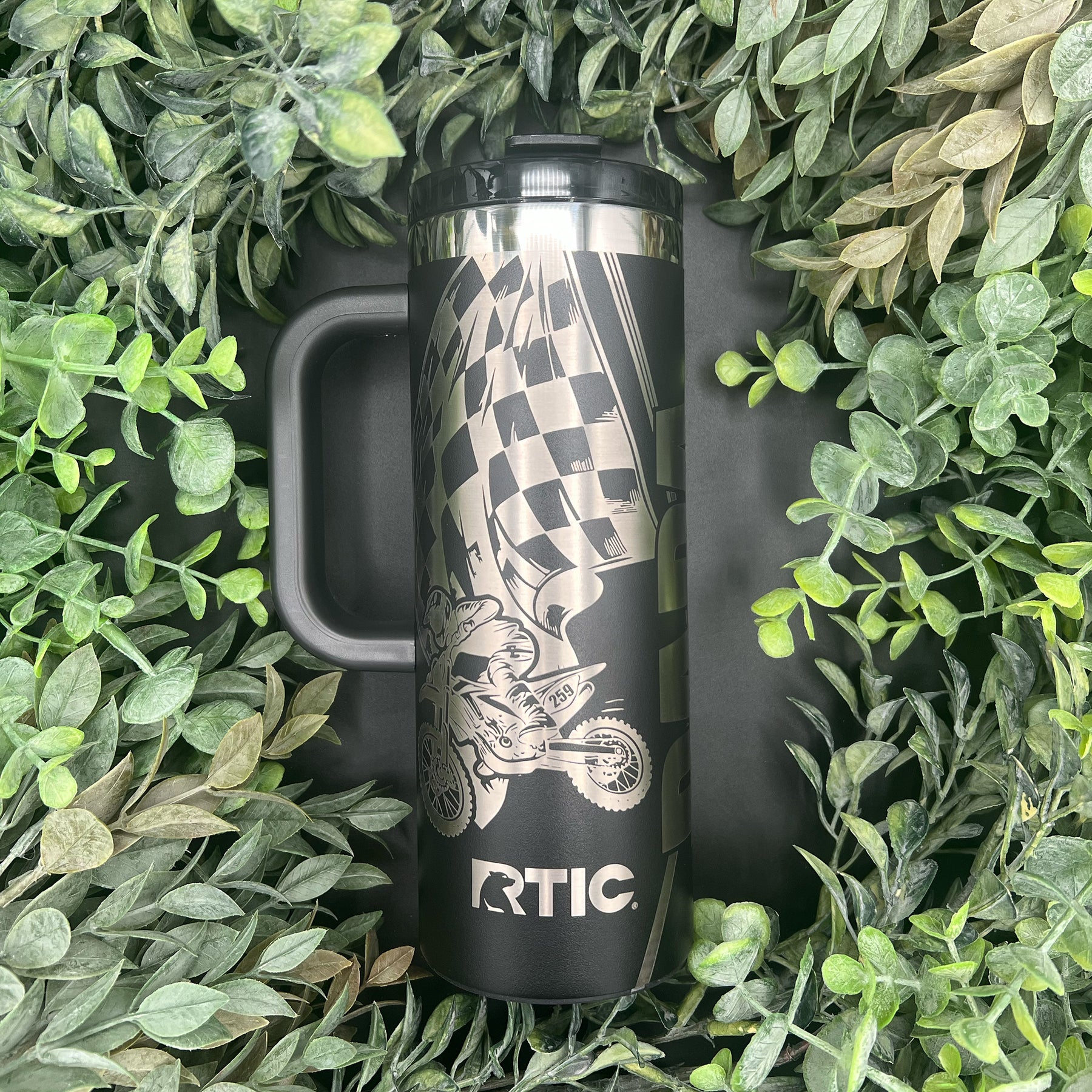 This custom engraved tumbler captures the adrenaline and energy of motocross with a bold, all-around design featuring dirt bike riders and racing flags. Whether you're trackside, gearing up for a ride, or just showing off your passion for racing, this tumbler makes a powerful statement.